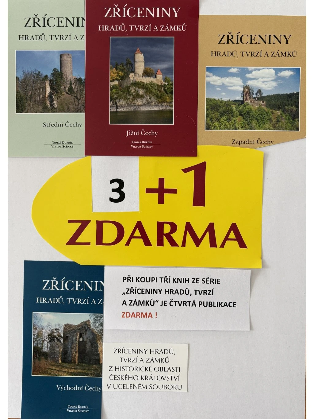 Pro čtenáře kteří si již zakoupili knihu Zříceniny... Východní Čechy nabízíme jedinečnou možnost dokoupit zbývající díly s výhodou 3+1 (tři knihy hradíte ZÁPADNÍ,STŘEDNÍ,SEVER) a čtvrtou (JIŽNÍ) máte ZDARMA!