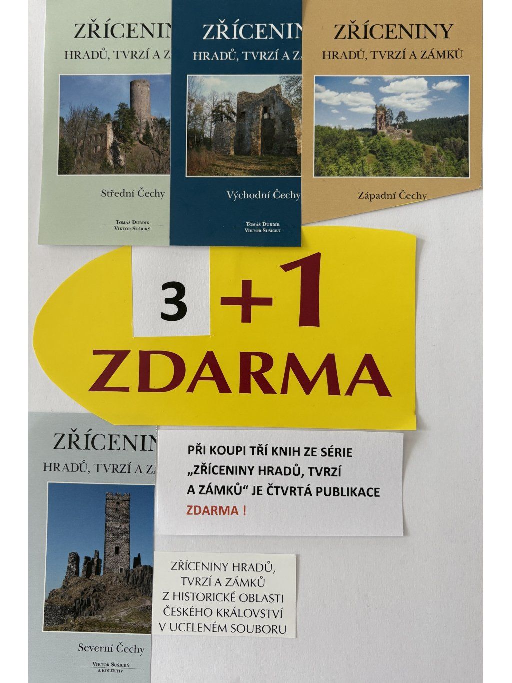 Pro čtenáře kteří si již zakoupili knihu Zříceniny... Jižní Čechy nabízíme jedinečnou možnost dokoupit zbývající díly s výhodou 3+1 (tři knihy hradíte - ZÁPADNÍ,STŘEDNÍ,VÝCHODNÍ) a čtvrtou publikaci (SEVERNÍ) máte ZDARMA!